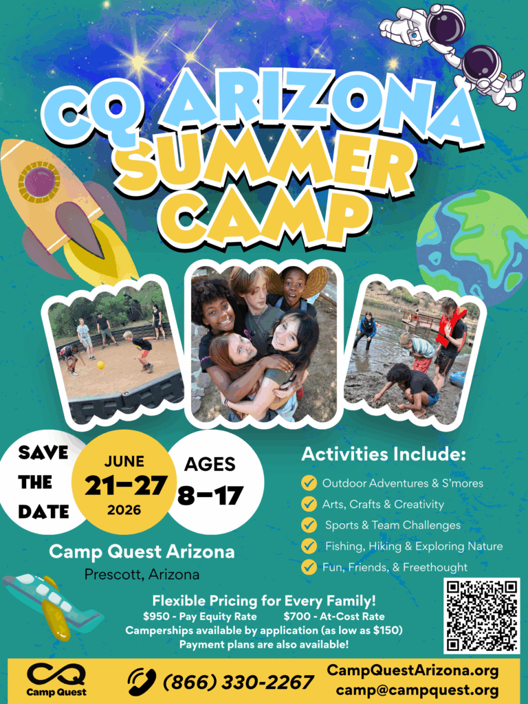 Camp Quest Arizona is open to all children and teenagers within the age range, but it is particularly geared towards building a community for children from atheist, agnostic, humanist and other freethinking families. Our goal is to provide a place where children can explore their developing worldviews, ask questions and make friends in an environment that is supportive of critical thinking and skepticism.